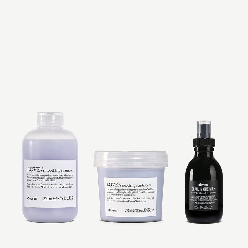 EHC LOVE SMOOTH SH 250ML: AQUA / WATER / EAU, DISODIUM LAURETH SULFOSUCCINATE, GLYCERIN, SODIUM LAUROYL METHYL ISETHIONATE, COCAMIDOPROPYL BETAINE, SODIUM COCOYL ISETHIONATE, SODIUM LAUROYL SARCOSINATE, COCO-GLUCOSIDE, PARFUM / FRAGRANCE, GLYCERYL OLEATE, ACRYLATES/C10-30 ALKYL ACRYLATE CROSSPOLYMER, SODIUM LAURYL SULFOACETATE, PANTHENOL, BENZYL ALCOHOL, PHENETHYL BENZOATE, SODIUM METHYL 2-SULFOLAURATE, COCONUT ACID, GLYCOL DISTEARATE, SODIUM METHYL ISETHIONATE, SODIUM BENZOATE, DICAPRYLYL ETHER, LAURYL ALCOHOL, LAURIC ACID, POLYQUATERNIUM-7, CITRIC ACID, GUAR HYDROXYPROPYLTRIMONIUM CHLORIDE, SODIUM ISETHIONATE, AMODIMETHICONE/SILSESQUIOXANE COPOLYMER, OLEA EUROPAEA FRUIT EXTRACT / OLEA EUROPAEA (OLIVE) FRUIT EXTRACT, TETRASODIUM GLUTAMATE DIACETATE, DISODIUM 2-SULFOLAURATE, SODIUM HYDROXIDE, TRISODIUM ETHYLENEDIAMINE DISUCCINATE, SODIUM LAURATE, TRIDECETH-5, GLYCERYL STEARATE, LIMONENE, CI 60730 / EXT. VIOLET 2, CI 19140 / YELLOW 5, CI 61570 / GREEN 5.EHC LOVE SMOOTH COND 250ML: AQUA / WATER / EAU, CETEARYL ALCOHOL, GLYCERIN, BEHENTRIMONIUM CHLORIDE, CETYL ALCOHOL, DIMETHICONE, CETRIMONIUM CHLORIDE, BEHENTRIMONIUM METHOSULFATE, ISOPROPYL ALCOHOL, PANTHENOL, BENZYL ALCOHOL, PARFUM / FRAGRANCE, DICAPRYLYL ETHER, LAURYL ALCOHOL, AMODIMETHICONE/SILSESQUIOXANE COPOLYMER, ORYZA SATIVA CERA / ORYZA SATIVA (RICE) BRAN WAX, DISODIUM EDTA, HYDROXYETHYLCELLULOSE, OLEA EUROPAEA FRUIT EXTRACT / OLEA EUROPAEA (OLIVE) FRUIT EXTRACT, SODIUM BENZOATE, CITRIC ACID, TRIDECETH-5, POLYQUATERNIUM-10, TOCOPHEROL, PHENOXYETHANOL, LIMONENE, CI 60730 / EXT. VIOLET 2, CI 19140 / YELLOW 5.OI ALL IN ONE MILK 135ML: AQUA / WATER / EAU, CETEARYL ALCOHOL, PANTHENOL, BEHENTRIMONIUM CHLORIDE, PARFUM / FRAGRANCE, BENZYL ALCOHOL, CETYL ALCOHOL, TOCOPHEROL, AMODIMETHICONE, CETRIMONIUM CHLORIDE, AMODIMETHICONE/SILSESQUIOXANE COPOLYMER, SODIUM BENZOATE, TRIDECETH-5, CITRIC ACID, GLYCERIN, TRIDECETH-12, CYCLOPENTASILOXANE, PHENOXYETHANOL, HELIANTHUS ANNUUS SEED OIL / HELIANTHUS ANNUUS (SUNFLOWER) SEED OIL, BIXA ORELLANA SEED EXTRACT, HEXAMETHYLINDANOPYRAN, EUCALYPTUS GLOBULUS OIL, ACETYL CEDRENE, TERPINEOL, CITRONELLOL, LAVANDULA OIL/EXTRACT, GERANIOL, METHYL SALICYLATE, ALPHA-ISOMETHYL IONONE, CAMPHOR, PELARGONIUM GRAVEOLENS FLOWER OIL, LINALOOL, LINALYL ACETATE, LIMONENE, CITRUS LIMON PEEL OIL / CITRUS LIMON (LEMON) PEEL OIL, PINENE.