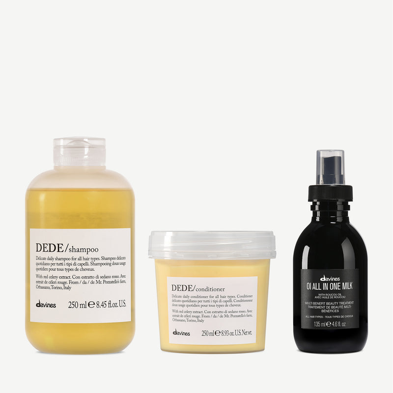 EHC DEDE COND 250ML: AQUA / WATER / EAU, CETEARYL ALCOHOL, BEHENTRIMONIUM CHLORIDE, GLYCERIN, HYDROXYPROPYL STARCH PHOSPHATE, CETRIMONIUM CHLORIDE, OLEIC ACID, GLYCERYL STEARATE, DIMETHICONE, BENZOTRIAZOLYL DODECYL P-CRESOL, ISOPROPYL ALCOHOL, BENZYL ALCOHOL, PARFUM / FRAGRANCE, PENTAERYTHRITYL TETRA-DI-T-BUTYL HYDROXYHYDROCINNAMATE, SCLEROTIUM GUM, POLYQUATERNIUM-6, VP/DMAPA ACRYLATES COPOLYMER, AMODIMETHICONE, ORYZA SATIVA CERA / ORYZA SATIVA (RICE) BRAN WAX, DISODIUM EDTA, SODIUM BENZOATE, APIUM GRAVEOLENS EXTRACT / APIUM GRAVEOLENS (CELERY) EXTRACT, BENZYL SALICYLATE, LINALOOL, CITRONELLOL, HYDROXYCITRONELLAL, CITRIC ACID, BENZALKONIUM CHLORIDE, CI 19140 / YELLOW 5, CI 14700 / RED 4.EHC DEDE SH 250ML: Aqua / Water / Eau, Sodium C14-16 Olefin Sulfonate, Sodium Lauroyl Methyl Isethionate, Cocamidopropyl Betaine, Decyl Glucoside, Sodium PCA, Sodium Methyl 2-Sulfolaurate, Disodium Coco-Glucoside Citrate, Parfum / Fragrance, Lauramidopropylamine Oxide, Polysorbate 20, Coco-Glucoside, Glyceryl Oleate, Panthenol, Benzyl Alcohol, Sodium Chloride, Sodium Methyl Isethionate, Sodium Benzoate, Citric Acid, Lauric Acid, Disodium 2-Sulfolaurate, Myristamidopropylamine Oxide, Polyquaternium-7, Trisodium Ethylenediamine Disuccinate, Guar Hydroxypropyltrimonium Chloride, Tetrasodium Glutamate Diacetate, Sodium Laurate, Apium Graveolens Extract / Apium Graveolens (Celery) Extract, Benzyl Salicylate, Linalool, Citronellol, Hydroxycitronellal, CI 19140 / Yellow 5, CI 14700 / Red 4OI ALL IN ONE MILK 135ML: AQUA / WATER / EAU, CETEARYL ALCOHOL, PANTHENOL, BEHENTRIMONIUM CHLORIDE, PARFUM / FRAGRANCE, BENZYL ALCOHOL, CETYL ALCOHOL, TOCOPHEROL, AMODIMETHICONE, CETRIMONIUM CHLORIDE, AMODIMETHICONE/SILSESQUIOXANE COPOLYMER, SODIUM BENZOATE, TRIDECETH-5, CITRIC ACID, GLYCERIN, TRIDECETH-12, CYCLOPENTASILOXANE, PHENOXYETHANOL, HELIANTHUS ANNUUS SEED OIL / HELIANTHUS ANNUUS (SUNFLOWER) SEED OIL, BIXA ORELLANA SEED EXTRACT, HEXAMETHYLINDANOPYRAN, EUCALYPTUS GLOBULUS OIL, ACETYL CEDRENE, TERPINEOL, CITRONELLOL, LAVANDULA OIL/EXTRACT, GERANIOL, METHYL SALICYLATE, ALPHA-ISOMETHYL IONONE, CAMPHOR, PELARGONIUM GRAVEOLENS FLOWER OIL, LINALOOL, LINALYL ACETATE, LIMONENE, CITRUS LIMON PEEL OIL / CITRUS LIMON (LEMON) PEEL OIL, PINENE.