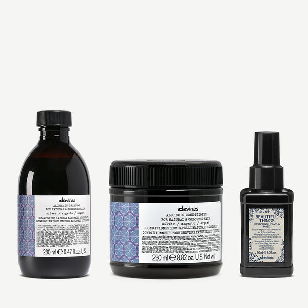 ALCHEMIC SH SILVER 280ML: AQUA / WATER / EAU, SODIUMLAUROYL METHYL ISETHIONATE, GLYCERIN, COCAMIDOPROPYLBETAINE, DISODIUM COCOAMPHODIACETATE, SODIUM LAUROYLSARCOSINATE, DECYL GLUCOSIDE, PANTHENOL, SODIUMCOCOYL GLYCINATE, ACRYLATES/C10-30 ALKYL ACRYLATECROSSPOLYMER, BENZYL ALCOHOL, SODIUM CHLORIDE,PARFUM / FRAGRANCE, POLYSORBATE 20, POLYESTER-11,SODIUM BENZOATE, SODIUM PCA, POLYQUATERNIUM-10,TRISODIUM ETHYLENEDIAMINE DISUCCINATE, GUAR HYDROXYPROPYLTRIMONIUMCHLORIDE, TETRASODIUM GLUTAMATEDIACETATE, ACID VIOLET 43.ALCHEMIC COND SILVER 250ML: AQUA / WATER / EAU, CETEARYL ALCOHOL, GLYCERIN,CETYL ALCOHOL, CETRIMONIUM CHLORIDE, BEHENETH-25, GLYCERYL STEARATE,POLYGLYCERYL-4 OLEATE, BENZYL ALCOHOL, ETHYLHEXYL METHOXYCINNAMATE,PARFUM / FRAGRANCE, SIMMONDSIA CHINENSIS SEED OIL / SIMMONDSIA CHINENSIS(JOJOBA) SEED OIL, TOCOPHEROL, DISODIUM EDTA, HYDROXYETHYLCELLULOSE,SODIUM BENZOATE, GLYCERYL OLIVATE, HYDROGENATED PALM GLYCERIDES CITRATE,HYDROGENATED RAPESEED ALCOHOL, SCLEROTIUM GUM, CITRIC ACID, ACID VIOLET 43.TMA BEAUTIFUL THINGS MASK 90ML: Aqua / Water / Eau, Cetearyl Alcohol, Parfum / Fragrance, Behentrimonium Methosulfate, Benzyl Alcohol, Hydroxypropyl Guar Hydroxypropyltrimonium Chloride, Cetyl Alcohol, Sodium Gluconate, Triolein, Cellulose, Cetearyl Olivate, Cetrimonium Chloride, Ethyl Oleate, Sorbitan Olivate, Glycerin, Dicocoyl Pentaerythrityl Distearyl Citrate, Isopropyl Alcohol, Sodium Benzoate, Olea Europaea Leaf Extract / Olea Europaea (Olive) Leaf Extract, Lactic Acid, Sclerotium Gum, 1,2-Hexanediol, Hydroxyacetophenone, Hydrolyzed Adansonia Digitata Seed Extract, Pentylene Glycol, Cyclodextrin, Citric Acid, Citrus Aurantium Sinensis Peel Extract, Citrus Reticulata Peel Extract / Citrus Reticulata (Tangerine) Peel Extract, Sh-Polypeptide-123, Cyamopsis Tetragonoloba Gum / Cyamopsis Tetragonoloba (Guar) Gum, Tocopherol, Xanthan Gum, Phytic Acid, Tetramethyl Acetyloctahydronaphthalenes, Juniperus Virginiana Oil, Linalool, Linalyl Acetate, Limonene, Alpha-Isomethyl Ionone, Geraniol, Citrus Aurantium Flower Oil, Cedrus Atlantica Oil/Extract, Isoeugenyl Acetate, Citrus Aurantium Peel Oil, Pogostemon Cablin Oil, Pinene, Rose Ketones, Citrus Limon Peel Oil / Citrus Limon (Lemon) Peel Oil, Citronellol